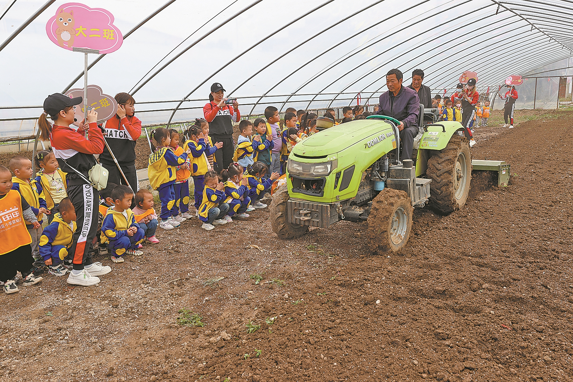 日前,幼儿园的小朋友们在大棚内观看机械犁地。当天,襄州区小苗苗幼儿园的小朋友走进位于古驿镇的驿寨蔬菜专业合作社蔬菜基地大棚,听科普志愿者讲解蔬菜对人体的好处,了解蔬菜的生长过程,亲手采摘蔬菜,感受劳动的快乐,从而养成爱吃蔬菜的好习惯。