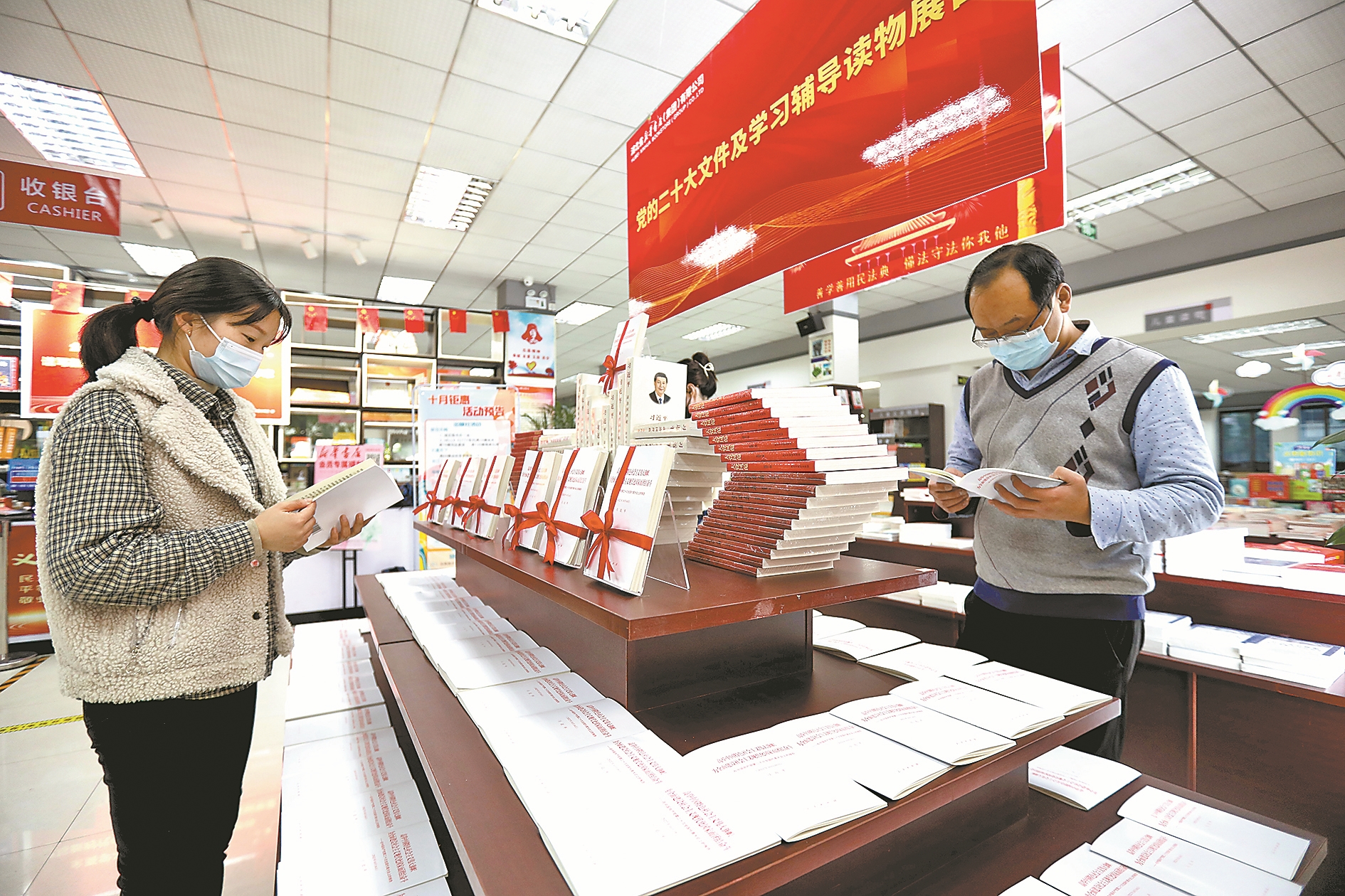 10月28日,在新华书店襄城店,市民在党的二十大文件及辅导读物专柜阅读选购图书。据了解,首批党的二十大报告单行本在我市4家新华书店同步上架。为确保在第一时间满足广大党员干部群众学习贯彻党的二十大精神的需求,我市新华书店提前谋划、全力以赴做好党的二十大文件及学习辅导读物的发行工作。