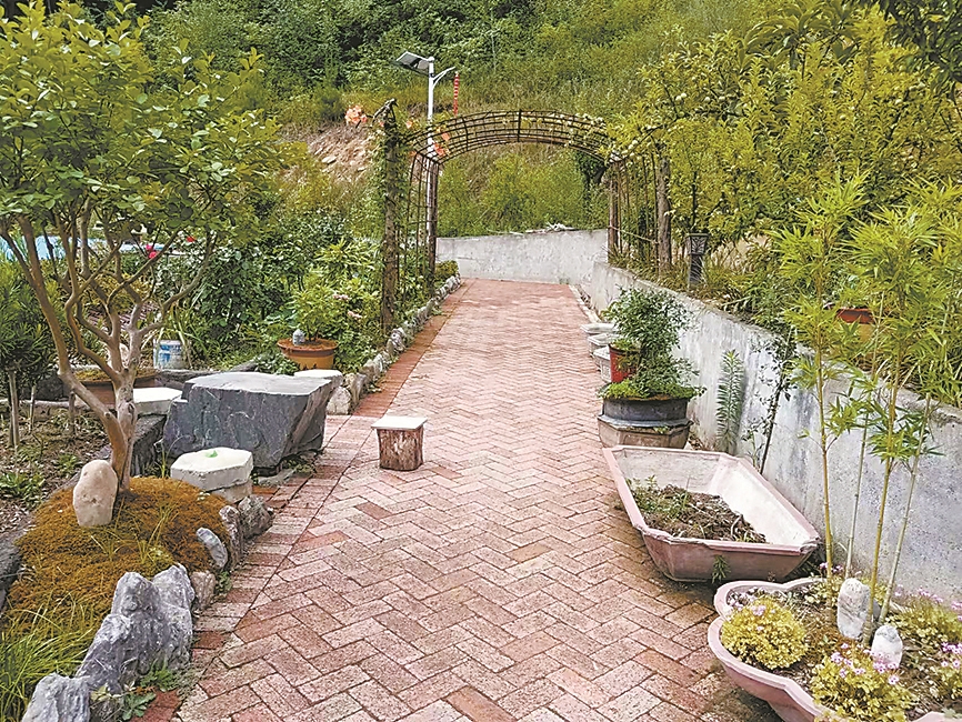 第二天,村民们拿着铁锹、镰刀、箩筐早早来到改造现场,有的负责搬碎石块,有的负责除杂草,有的负责收捡垃圾……水泥、砖石等建筑材料到位后,村民们又自发地协助建筑工人建设,不到15天全部完工。村民纷纷把自家的绿植、花卉搬到这里。手巧的村民还将废弃轮胎、水桶改造成了花盆,“背旮旯”华丽变身为小花园。(如图)