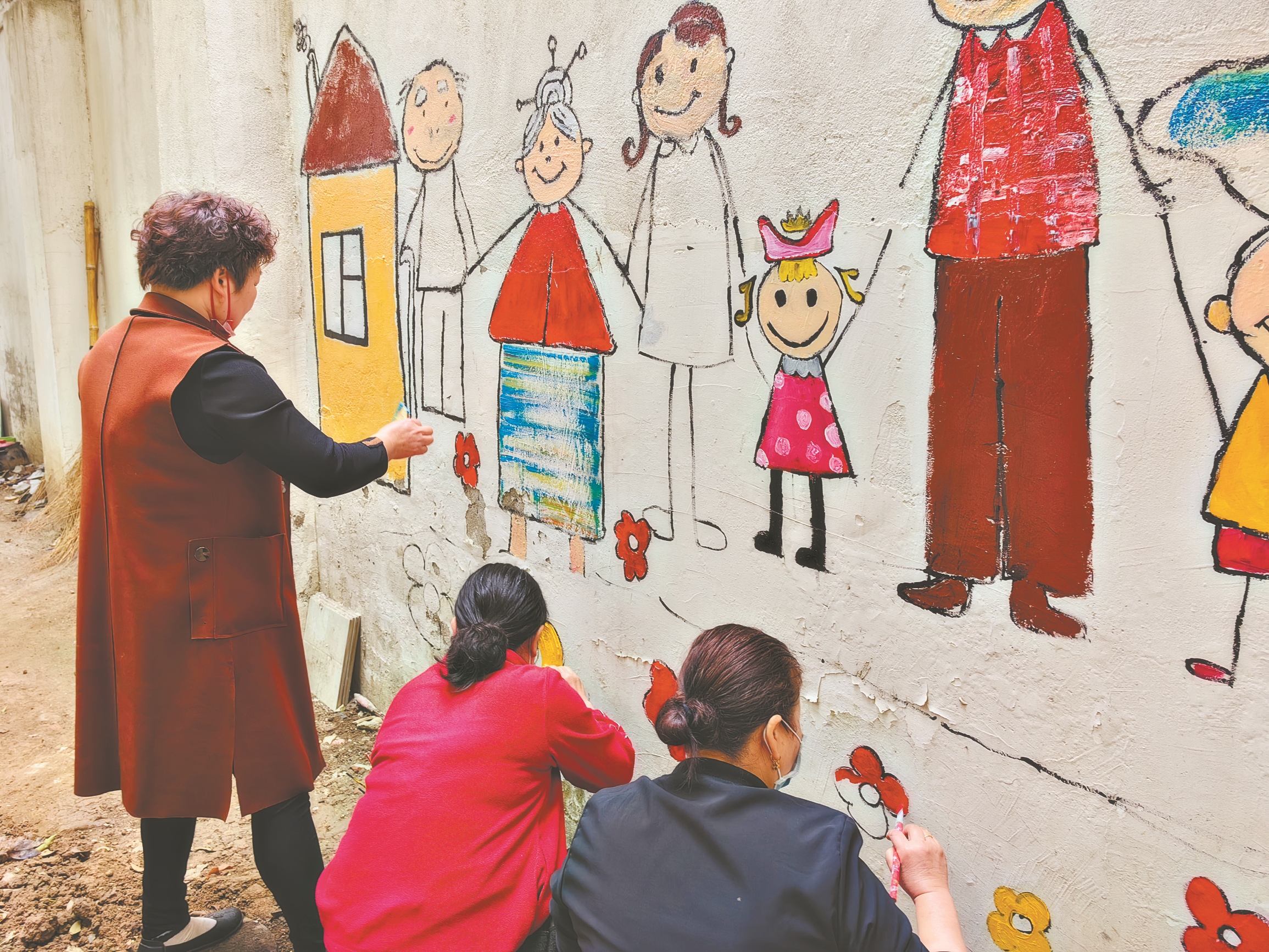 在钱进的指导下,其他居民也参与进来,大家认真调色、上色,为小区增添了一道亮丽的风景。