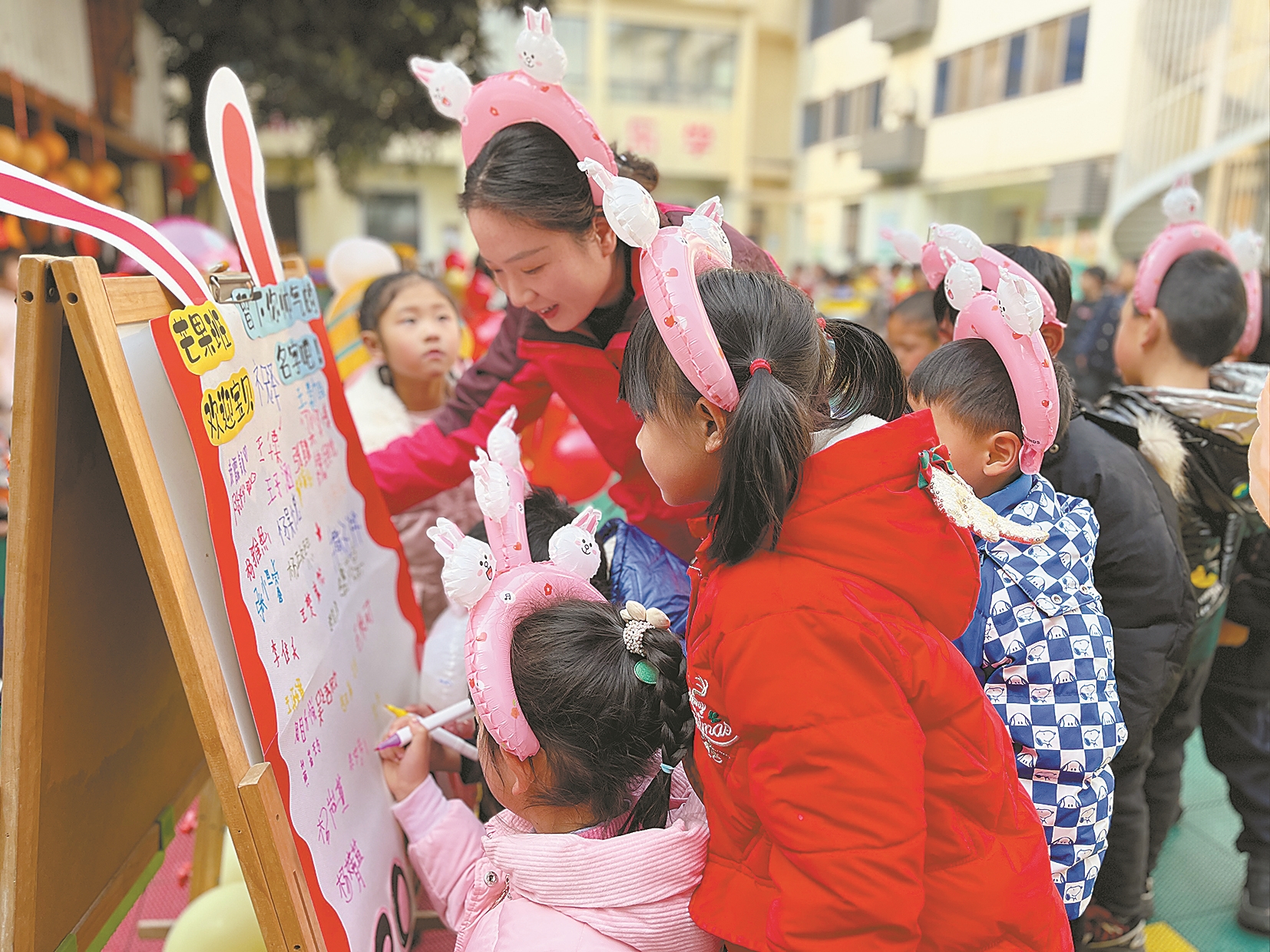 2月7日,襄阳市襄城教工幼儿园开学,孩子们在老师的带领下参加了“送吉祥”“猜灯谜”“新学期创意签名”等游戏活动,全园教师与幼儿在欢声笑语中开启新学期。
