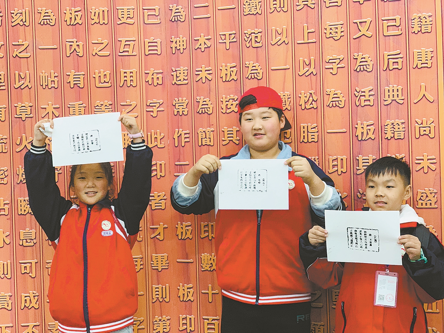 活动中,我们不仅大饱眼福,而且还体验了用清水练书法,观摩了古法造纸和活字印刷术,挑战了一分钟内拼好诗词华容道……体验印刷,我们很投入。