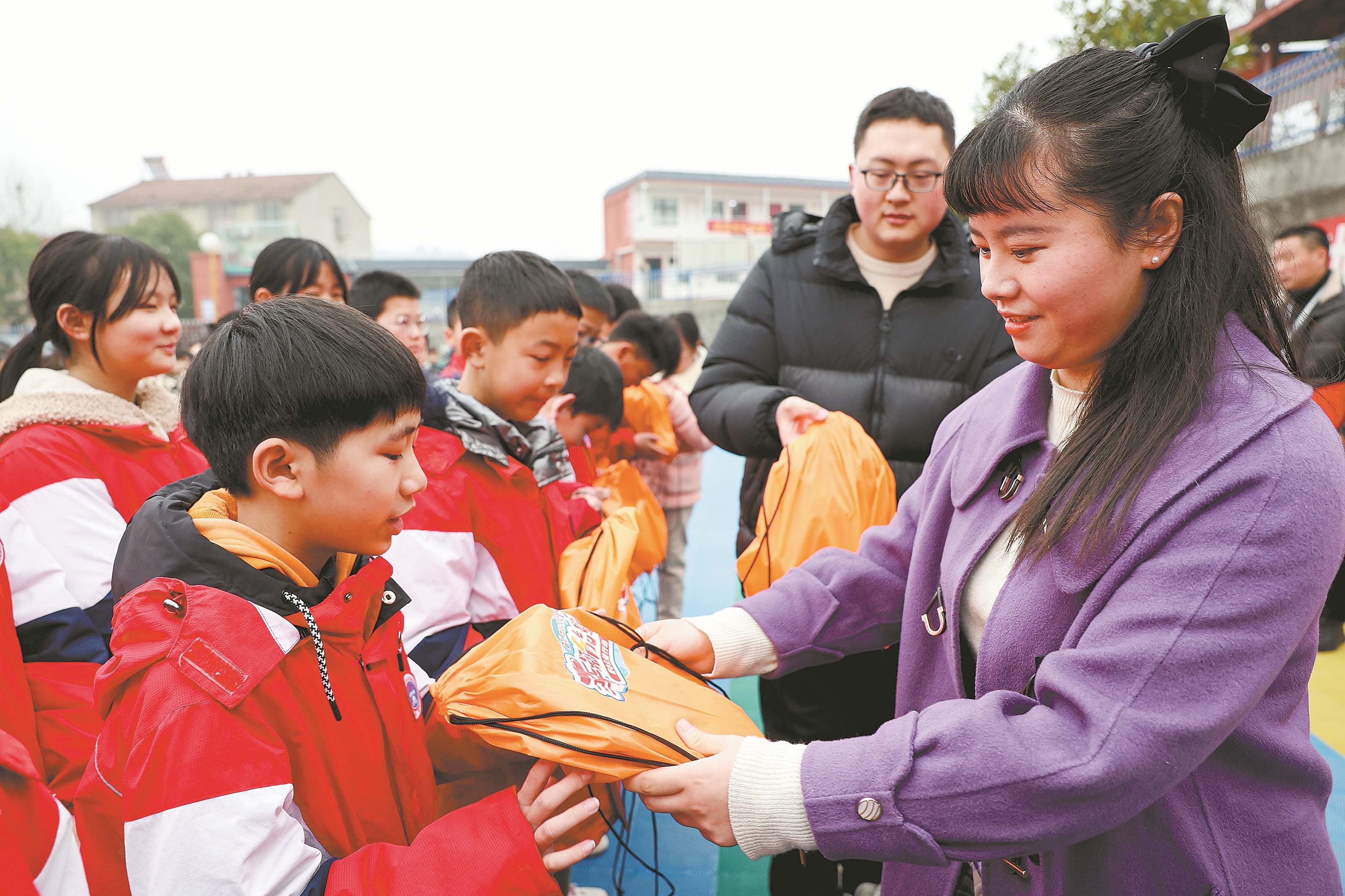 3月1日,在襄城区汉水国学实验学校,志愿者为学生送去爱心物资。当日,由团市委、湖北石花酒业联合发起的2023年“幸福花儿”爱心公益行动启动,志愿者们来到襄城区黄家湾小学、汉水国学实验学校、襄阳市第二十六中学等学校,为留守儿童送去跳绳、毽子、乒乓球拍等运动器材。