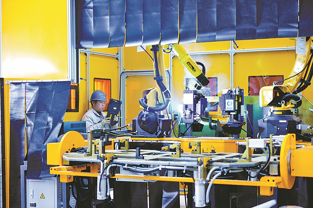 3月9日,中力电动叉车老河口生产基地组装车间下车架自动焊接线上,工人正对调试优化后的全自动焊接设备进行检测。