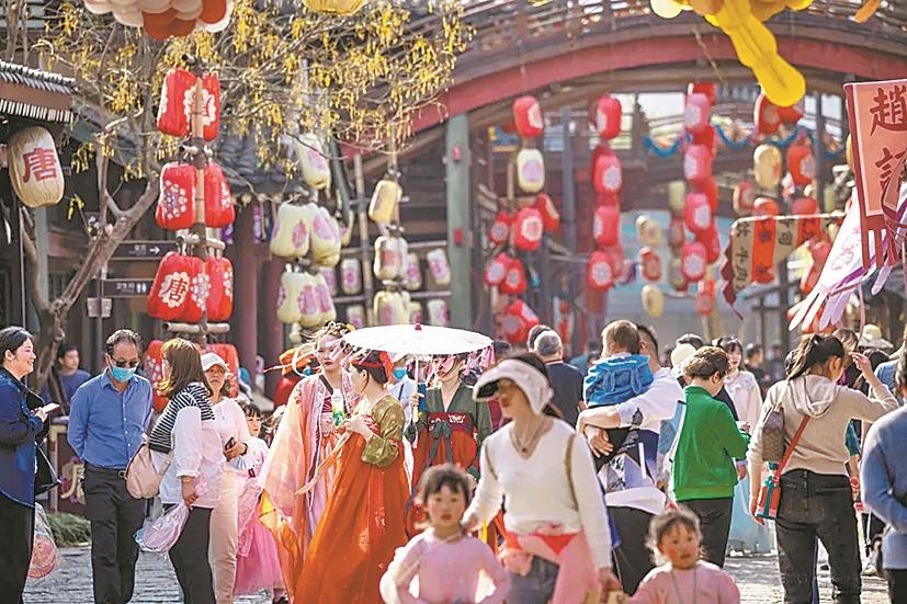 火爆的场景同样出现唐城景区。停车场内旅游大巴浩浩荡荡,在导游的指引下,研学团的小学生、操着南北口音的外地游客有序入园。大气的建筑、灿若云霞的樱花,映衬着一张张笑脸。穿着汉服的小姐姐撑着油纸伞漫步景区,打卡电视剧《梦华录》拍摄地,体验穿越千年的极致浪漫。