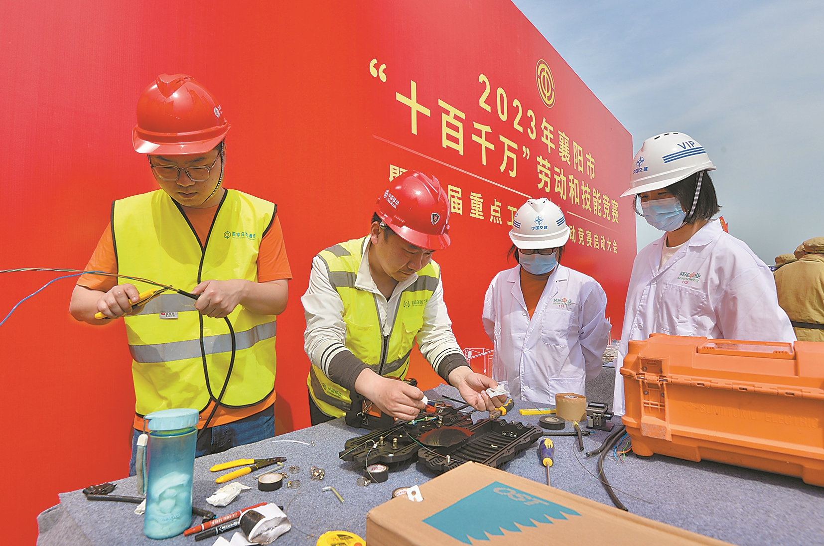 4月10日,2023年襄阳市“十百千万”劳动和技能竞赛暨首届重点工程项目劳动竞赛启动大会在牛首汉江特大桥项目工地举行,旨在展现劳动美。图为参赛人员展示通信信号设备制造与维护技能。