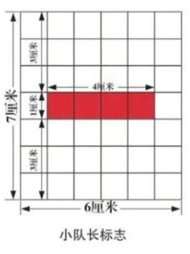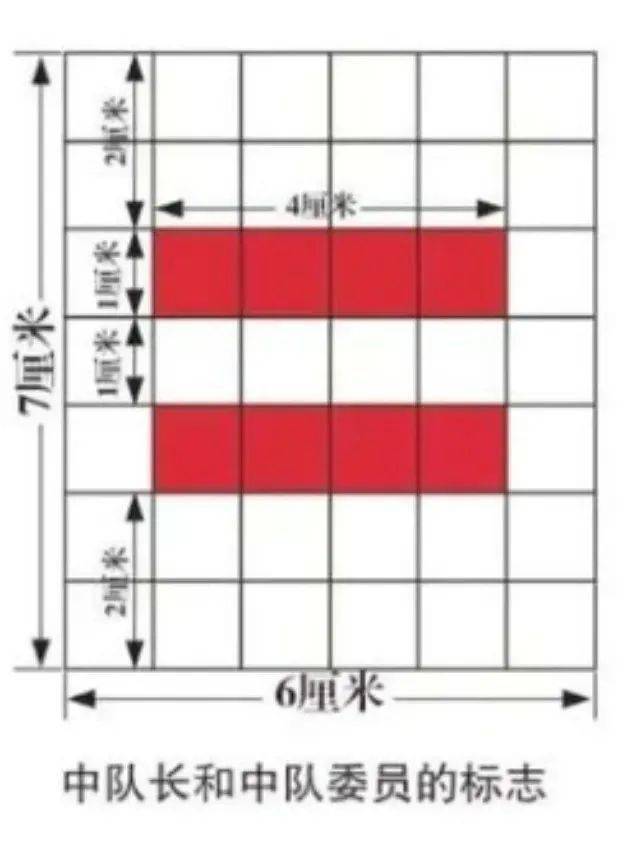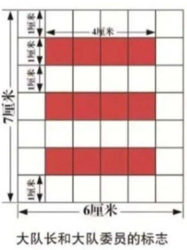 由白底、红杠组成,白底高7厘米、宽6厘米,红杠长4厘米、宽1厘米,大队委标志中间为三条红杠,中队委标志中间为两条红杠,小队长标志中间为一条红杠。红杠之间间隔1厘米,与白底左右边缘各相距1厘米,大队委标志上下各空1厘米,中队委标志上下各空2厘米,小队长标志上下各空3厘米。