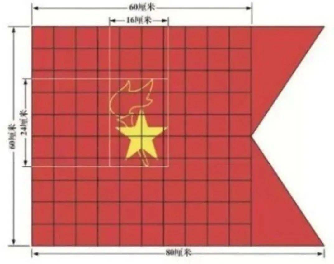 中队旗长80厘米、高60厘米。右端剪去高20厘米、底宽60厘米的等腰三角形,形成一个三角形缺口,五角星及火炬在以60厘米为边长的正方形中心。