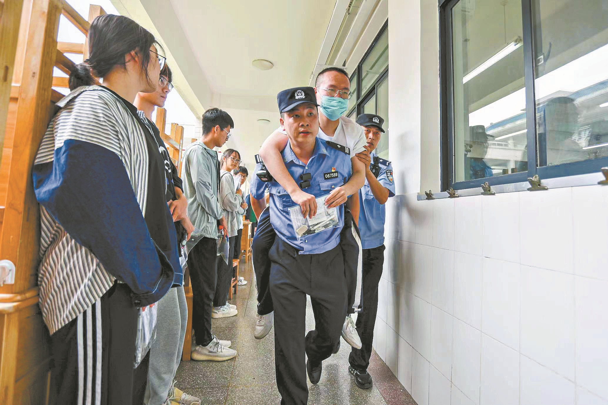 民警背着小周进出考场。 通讯员 司世伟 全媒体记者 王虎 摄