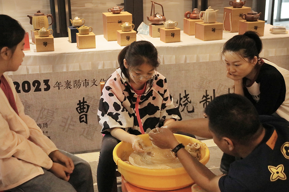 活动现场,襄州“司老爷”以他独特的扮相和造型,引得游客打卡拍照;嘎嘣脆的双沟锅巴则让游客一经品尝便忍不住扫码购买;曹氏陶器烧制技艺则邀请观众朋友自己动手体验非遗文化,参与者们手持陶土,认真地揉捏,将陶土慢慢地变成了一个个稚嫩的陶艺品,虽然不太完美,但乐在其中。除了制作陶艺品,活动现场还设置了陶艺展览区,展示了精美的陶艺作品,引得大家纷纷驻足观看,不时发出惊叹!