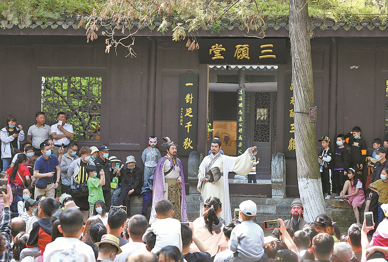 游客在古隆中风景区三顾堂前观看演出。 全媒体首席记者 杨东 摄