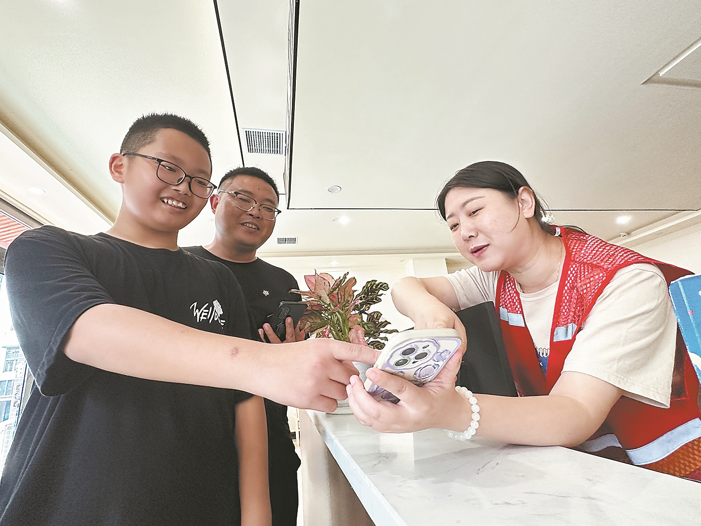 6月28日,在樊城区鹿角门社区,社区志愿者为辖区参加完中考的学生和家长开展反诈宣传,警惕“招录”陷阱。