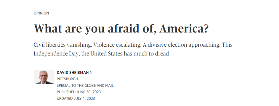 中国日报网7月6日电(党超峰)当地时间7月4日,加拿大报纸《环球邮报》网站刊发美国《匹兹堡邮报》执行编辑大卫·施里布曼的文章《美国,你在害怕什么》。