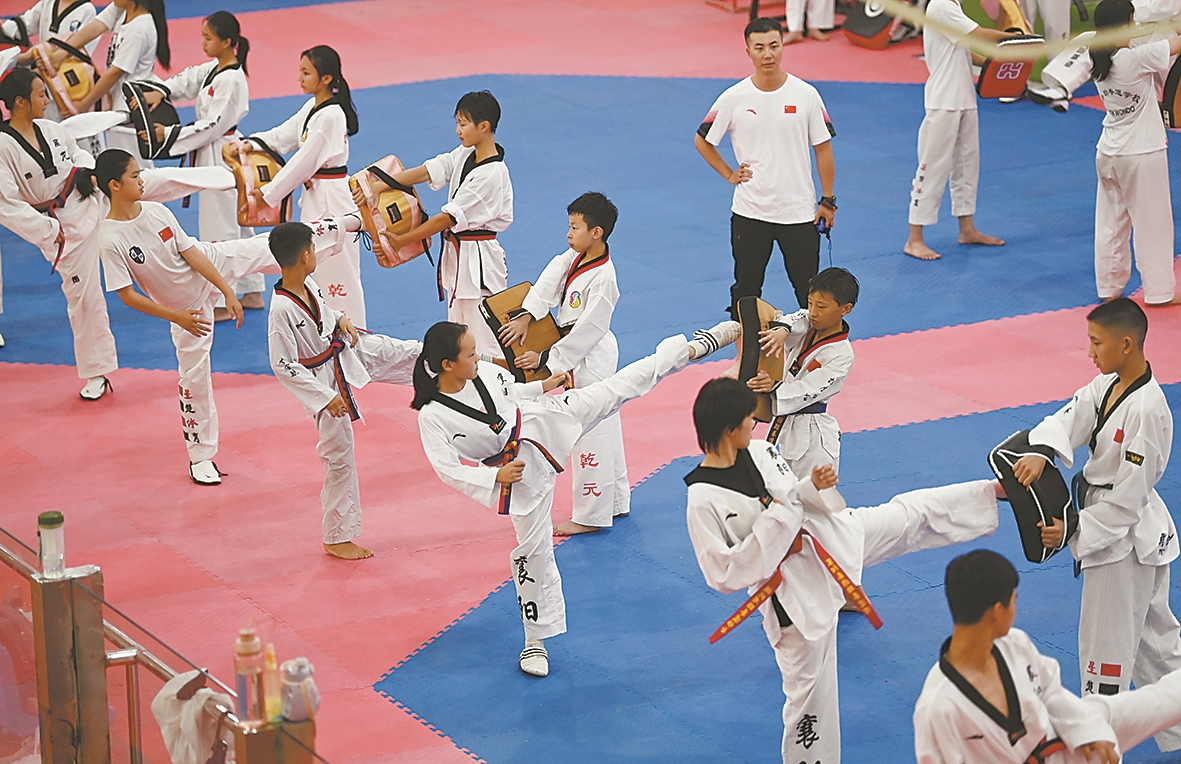 7月6日,孩子们在襄阳市体育馆练习跆拳道。当日,襄阳市跆拳道协会组织全市种子学员进行集中训练,备战省运会。近年来,襄阳以赛事为抓手,不断拓展青少年体育训练项目,让广大青少年在学习之余积极参与体育项目,促进全面发展。