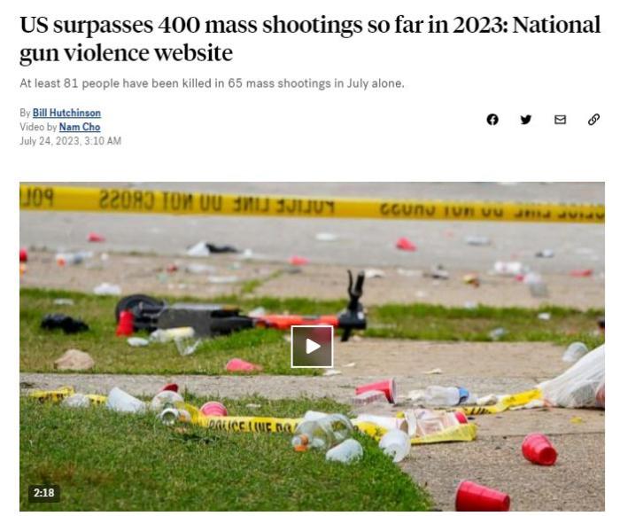 中新网7月24日电 据美国广播公司(ABC)24日报道,美国“枪支暴力档案”的数据显示,在2023年,美国已发生超过400起大规模枪击事件。该网站将大规模枪击事件定义为造成4人或4人以上伤亡的单一事件。