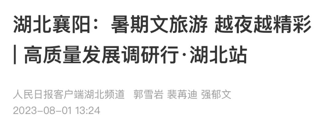 8月1日,人民日报客户端发表文章《湖北襄阳:暑期文旅游 越夜越精彩丨高质量发展调研行·湖北站》,聚焦襄阳暑期文旅游与夜经济的发展。