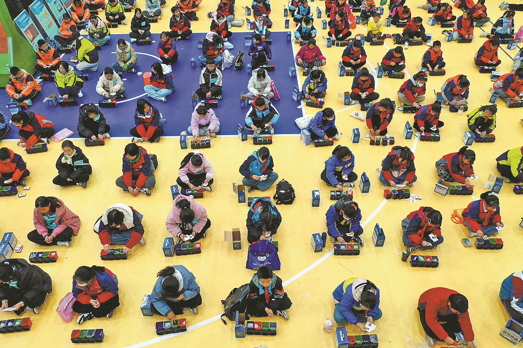 12月14日,在保康县后坪镇中心学校,学生参加垃圾分类计时赛(无人机照片)。当天,保康县第二届青少年科技节在保康县后坪镇中心学校举行。此届科技节以“探究科学、开拓创新、启迪未来”为主题,来自该县24所中小学校的550多名学生参加了七巧科技、电子制作、垃圾分类等项目的比赛,探索科学奥秘,感受科技魅力。