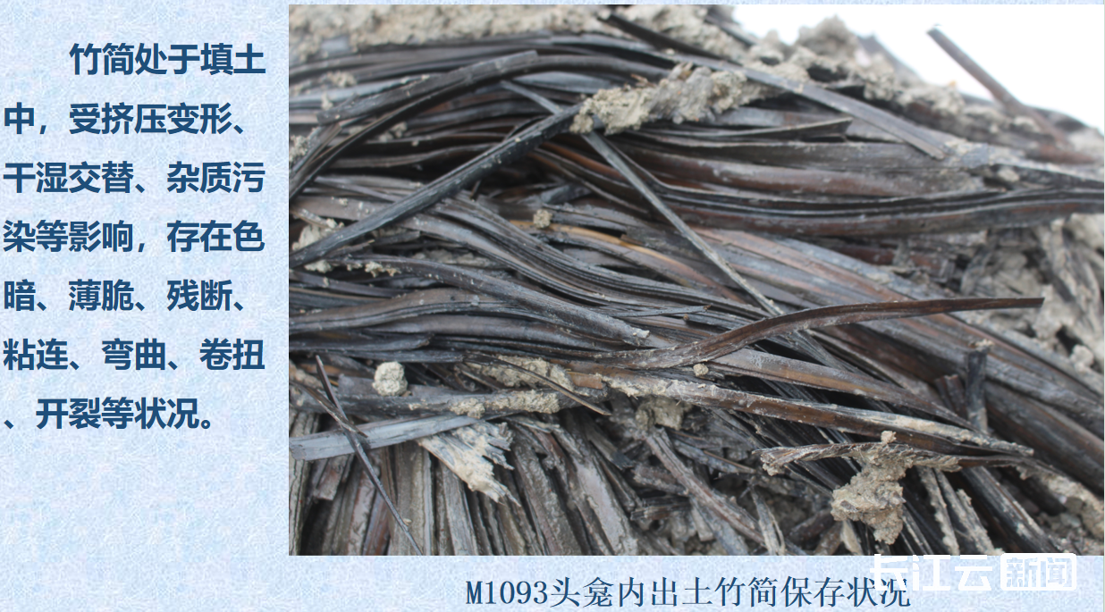 “秦家咀出土的竹简它那个墓葬就比较干,土压得比较紧,那些泥土的附着物比较坚硬,清洗的时候难度还有点大,就是慢慢地轻轻地洗下来的。里面只要是有字的我们都是一枚一枚把它轻轻挑出来,特别小心,比平时出土的竹简花的时间要长一倍。”荆州文物保护中心简牍修复室修复师贺巧云说。