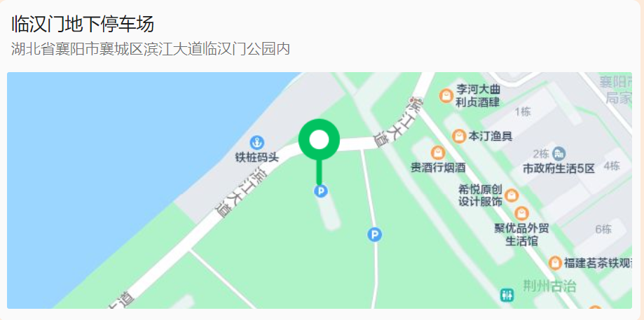 03停车场:临汉门地下停车场临汉门地下停车场湖北省襄阳市襄城区滨江大道临汉门公园内