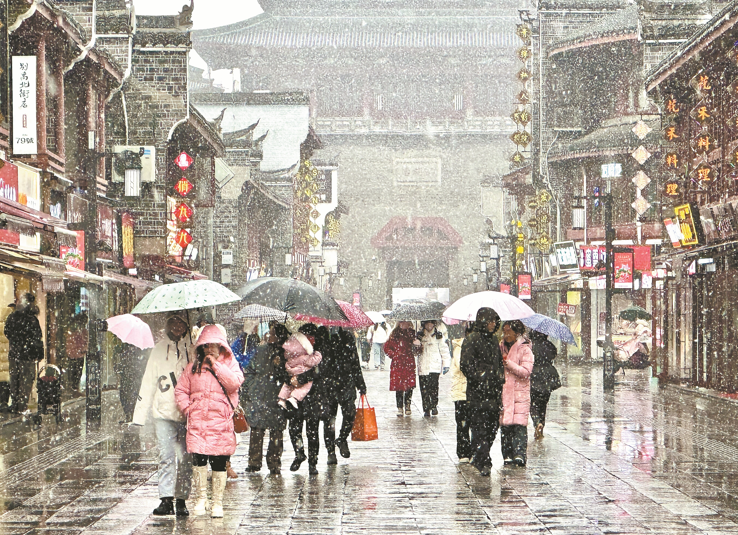 1月18日,游客在漫天飞雪中游览襄阳古城北街。