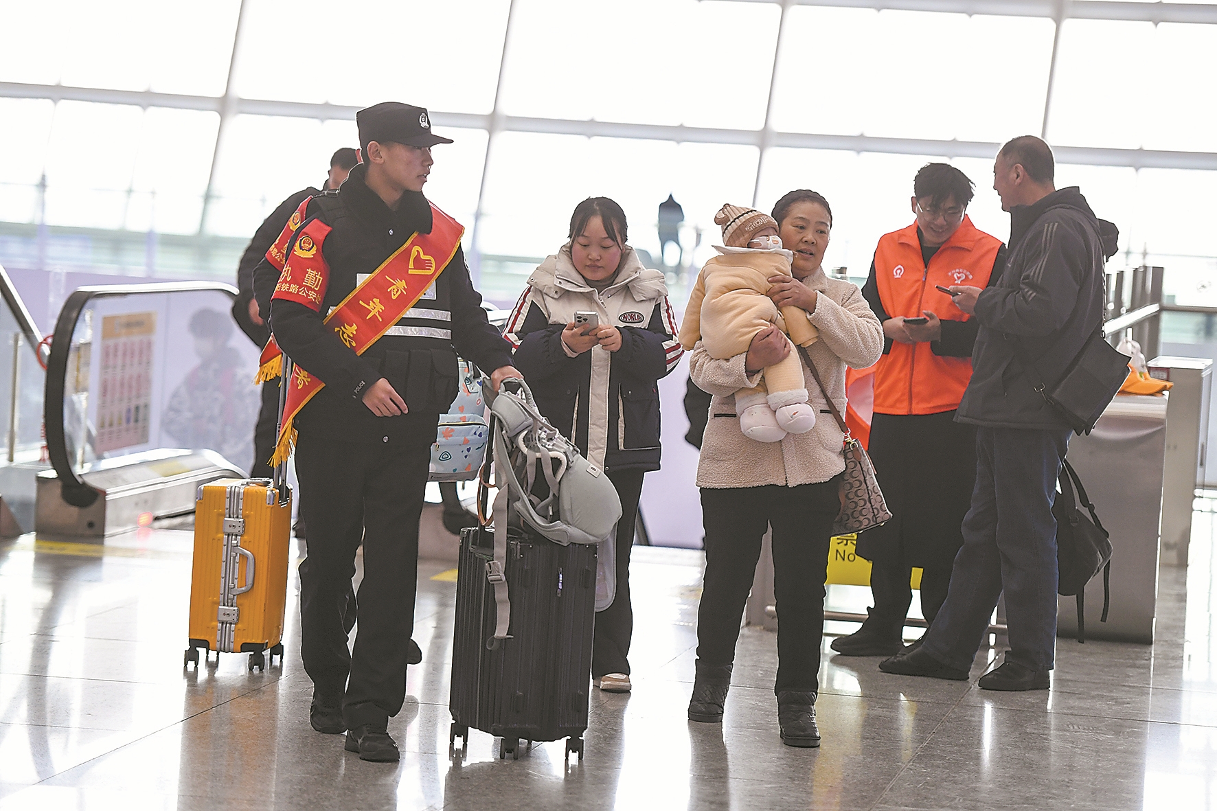 近日,襄阳铁路公安处青年志愿者在襄阳东站为旅客提供引导服务。为全面实现“平安春运、有序春运、温馨春运,让旅客体验更美好”的工作目标,襄阳铁路公安处开启多项春运志愿服务活动,广泛组织青年志愿者在辖区铁路站点常态化开展问询指引、秩序维护、反诈宣传、接力帮扶等服务。