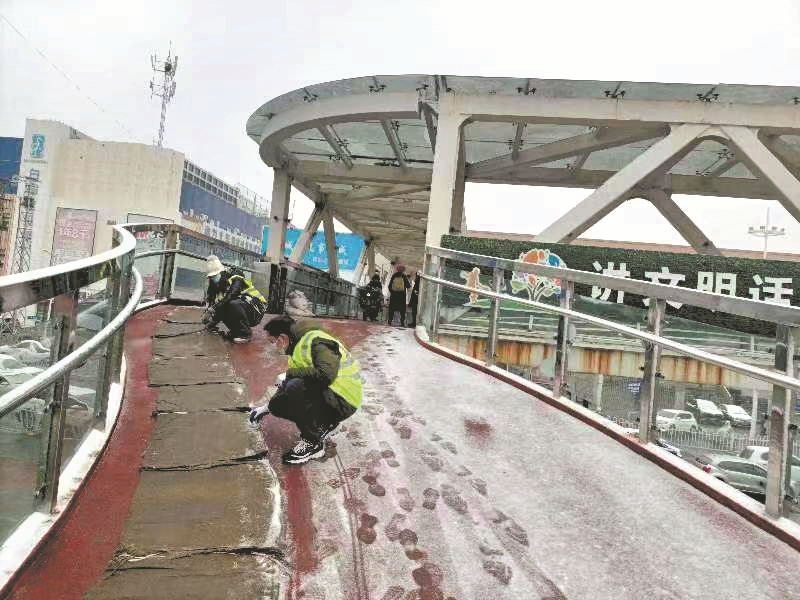 降雪让市区过街天桥的路面变得湿滑难行。2月1日8时22分,市住建局市政管理处启动四级应急预案,全体人员出动,开展除冰扫雪工作,保障市民出行安全。
