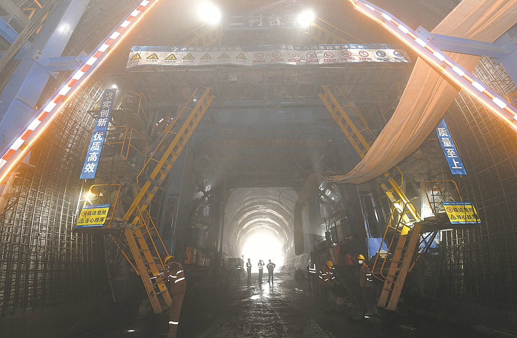 3月14日,中铁十八局工人在位于保康县马良镇的引江补汉工程输水隧洞8号平洞施工现场施工。