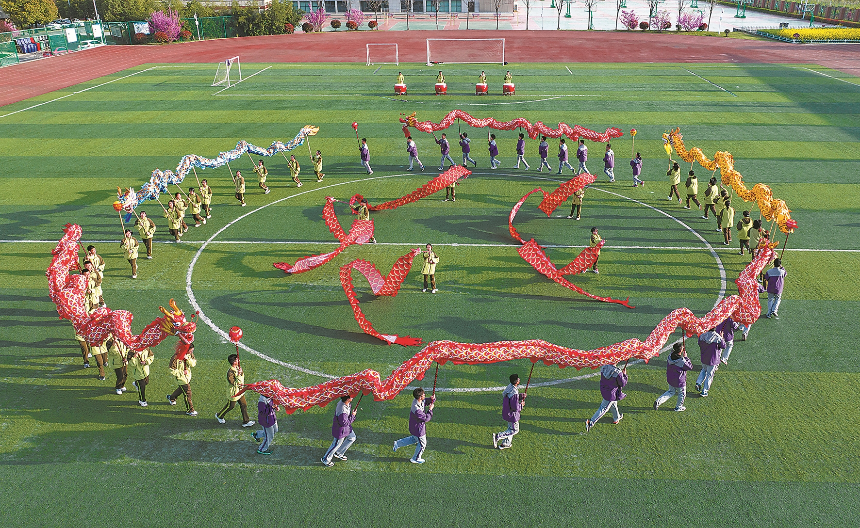3月28日,襄阳三中学生在体育课上练习舞龙。今年春季开学以来,襄阳三中在全校推广传统舞龙技艺,让学生在体育课中学习舞龙的基本技能,传承和弘扬传统文化。