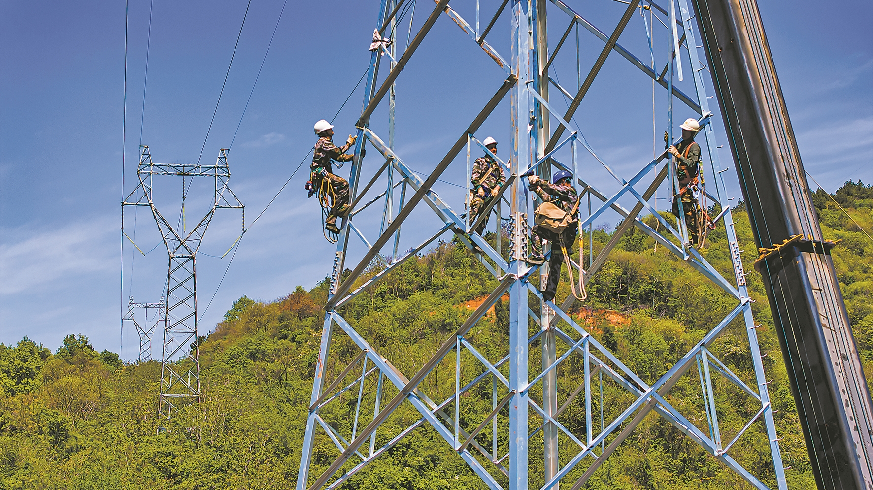 4月10日,襄电集团输变电工程分公司加快推进襄荆高铁配套220千伏胡漳牵线迁改工程。图为施工人员正紧张吊装G2#、G5#、G6#塔。