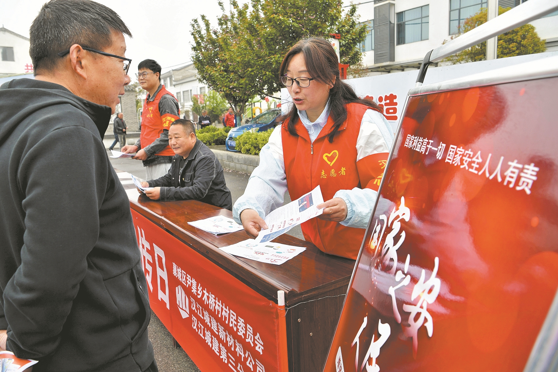 4月12日,在襄城区尹集乡木桥村,汉江城建第三分公司、汉江城建新材料公司联合木桥村为村民讲解国家安全知识。