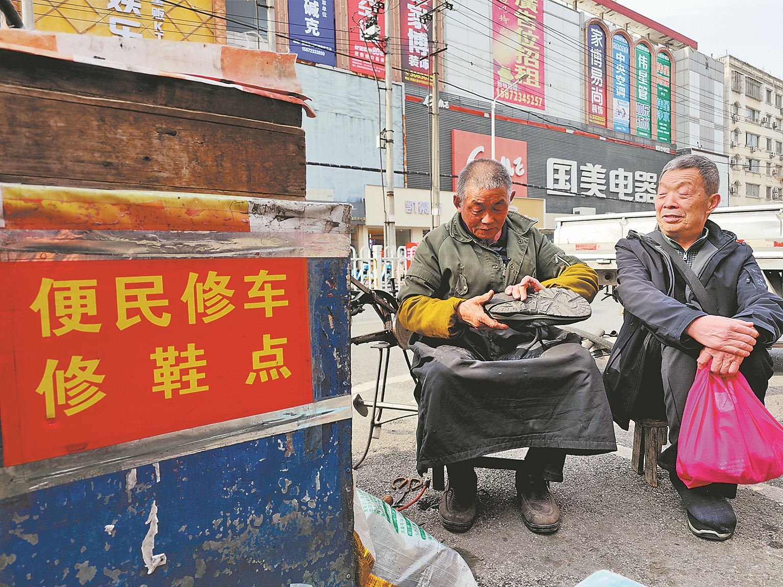 段居生(左)为顾客修鞋