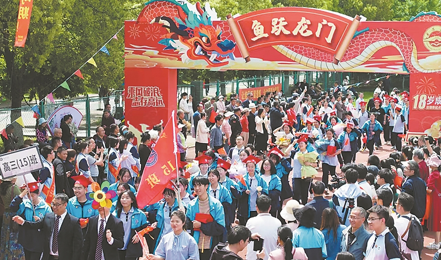 4月20日,襄阳五中为高三学生举办了隆重的成人礼仪式。学校领导向学生赠送《中华人民共和国宪法》读本,班主任带领学生列队依次穿过一岁门、三岁门、六岁门、十二岁门、十五岁门、成人门、成才门、成功门、鱼跃龙门,激励学生“十八而志,拼搏圆梦”。