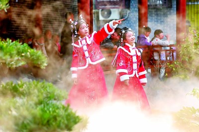 两位身着传统服饰的小游客在襄阳古城游玩。杨东摄