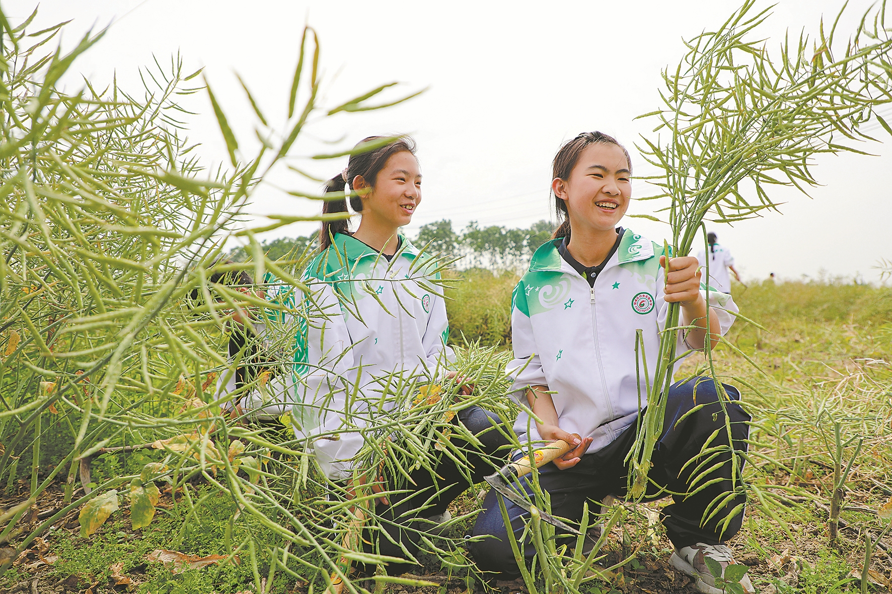 5月9日,樊城区竹条实验中学的学生们在老师的带领下来到田间采收成熟的油菜籽,在动手实践中学农事,体会劳动的意义。