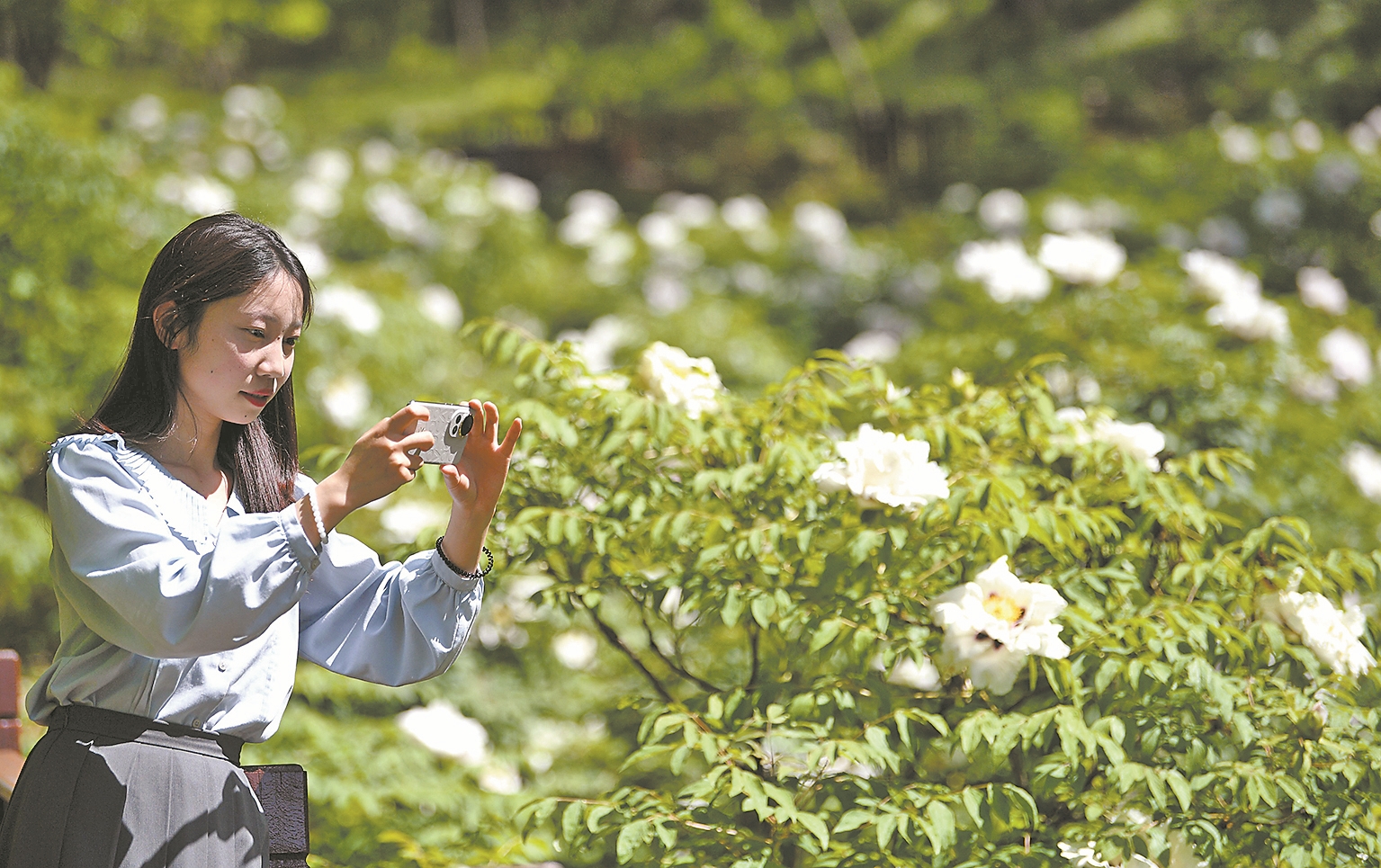 5月14日,游客在保康县大水林场野生紫斑牡丹园赏花拍照。近日,这里的野生紫斑牡丹盛开,吸引游客前来赏花、游玩。