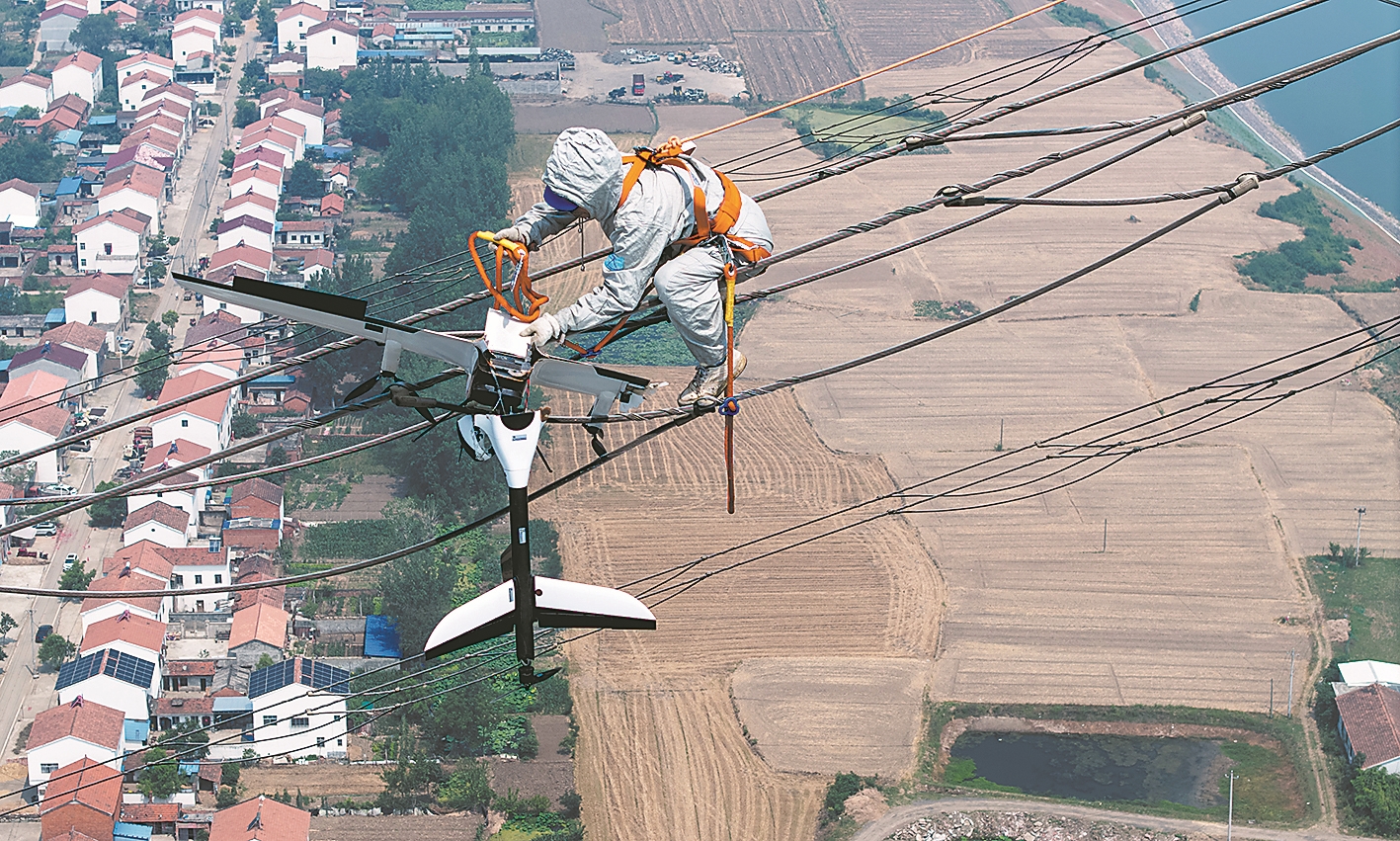 5月23日,在宜城市小河镇明正村,离地183米的110千伏楚泉线51-52号铁塔附近,国网襄阳供电公司输电运检分公司工作人员余三建身穿厚重的绝缘遮蔽服,采取等电位带电作业方式,在高空中将挂在电线上的一架民用固定翼无人机取下,并顺利带回地面。