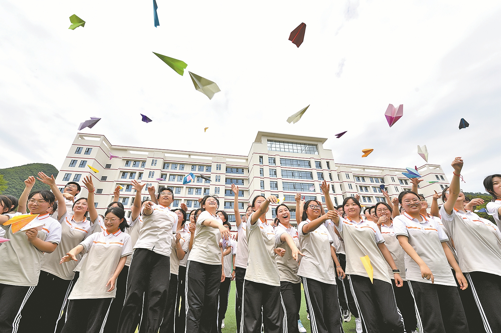 5月30日,在保康县第一中学,高三的学生们将纸飞机抛向空中。