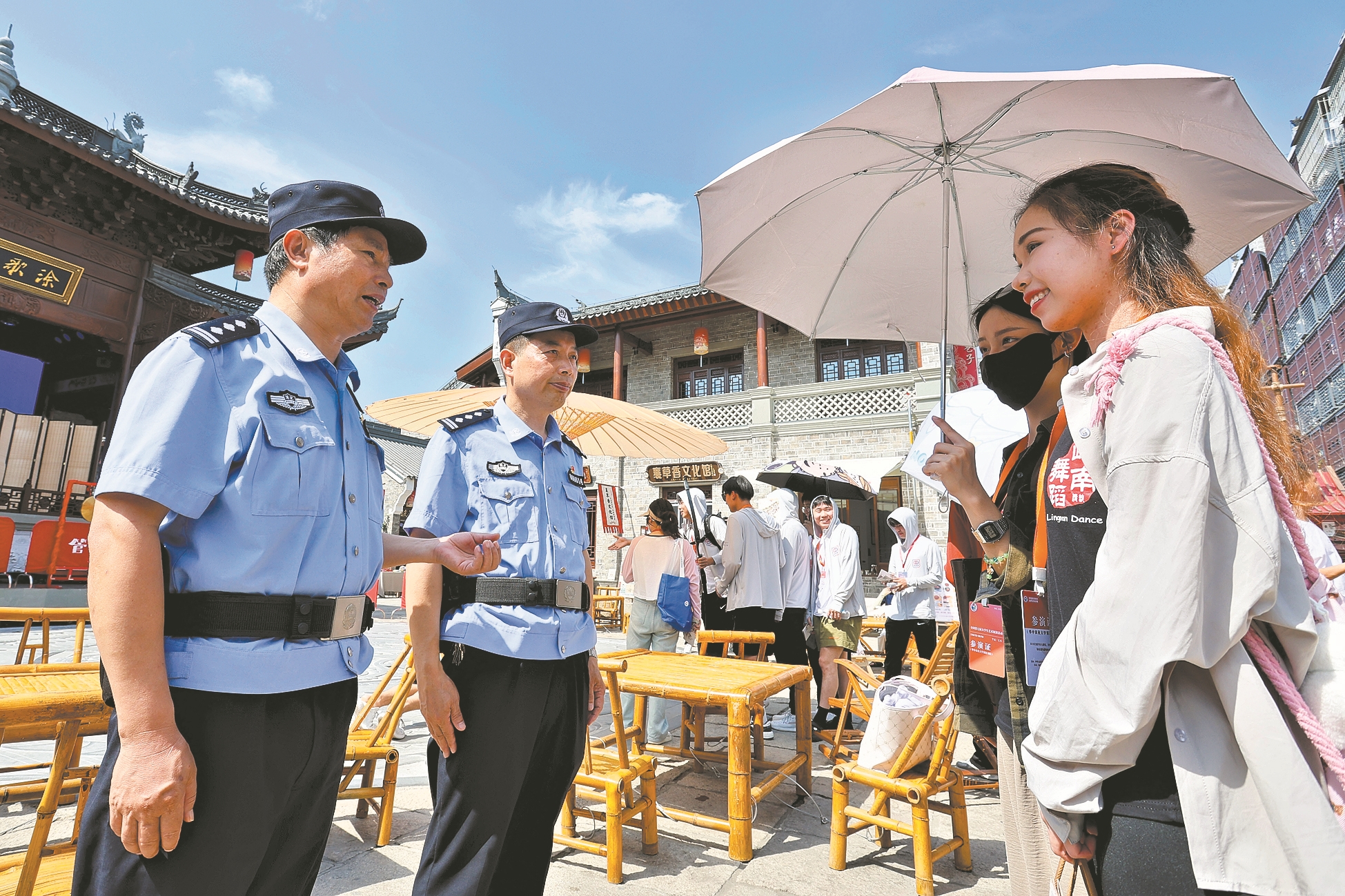 6月14日,在襄城管家巷,民警为开展社会实践的全国大艺展师生介绍景区概况。