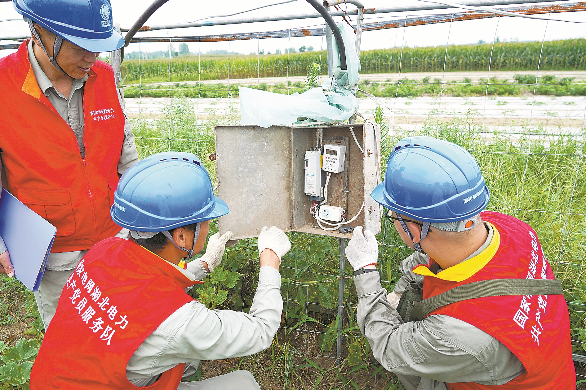 7月8日,国网老河口市供电公司酂阳供电所“鄂电红马甲”共产党员服务队结合当地王府洲火龙果种植户施肥、排灌等用电需求,深入田间地头对排灌线路、电力设施进行安全用电排查和隐患整治,保障种植户用电无忧,助力产业发展。