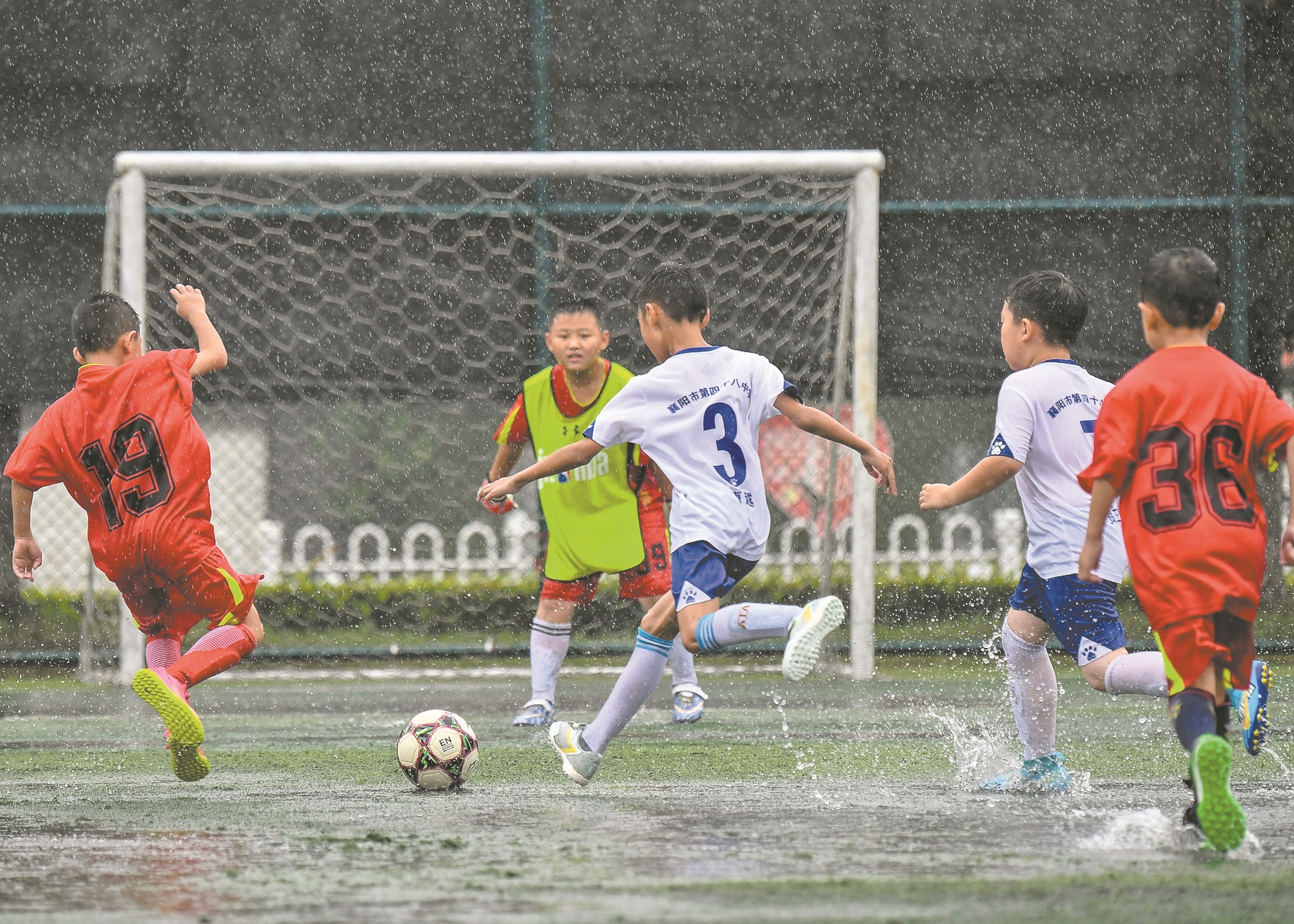 7月7日,“阳光体育”2024年襄阳市青少年体育联赛暨湖北省锦标赛足球选拔赛正式开赛。来自襄阳市各县(市)区、全市传统项目学校以及全市青少年后备人才基地的26支队伍的近400名运动员参赛。图为小运动员在冒雨激战。