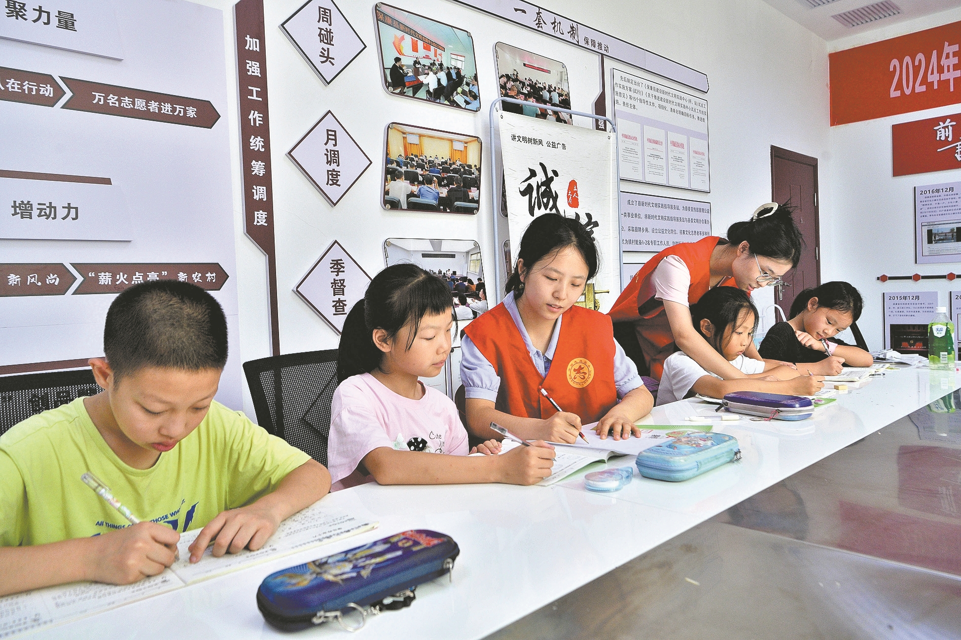 7月12日,在保康县新时代文明实践中心,大学生志愿者在给学生辅导作业。