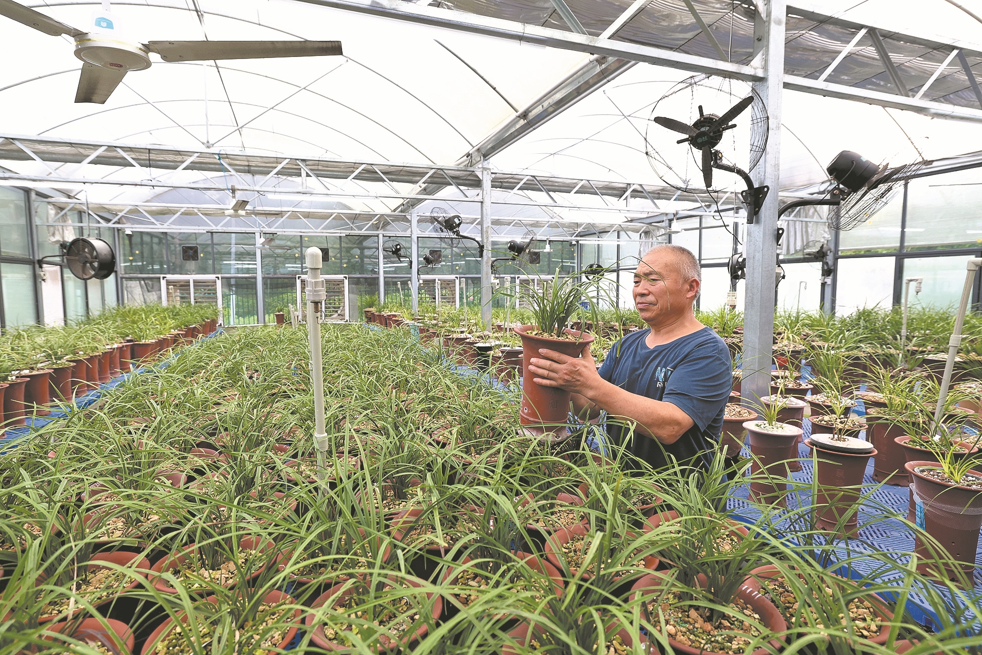 7月12日,在襄城区余家湖街道办事处钱营社区五组智能化温控兰花大棚中,种植户查看兰花的长势。近年来,钱营社区深度挖掘兰花文化,以美丽乡村示范片建设项目为契机,采用“社区+兰协+兰友”合作模式,打造现代化的兰花种植基地,促进兰花产业和文旅农康深度融合,带动周边群众增收。