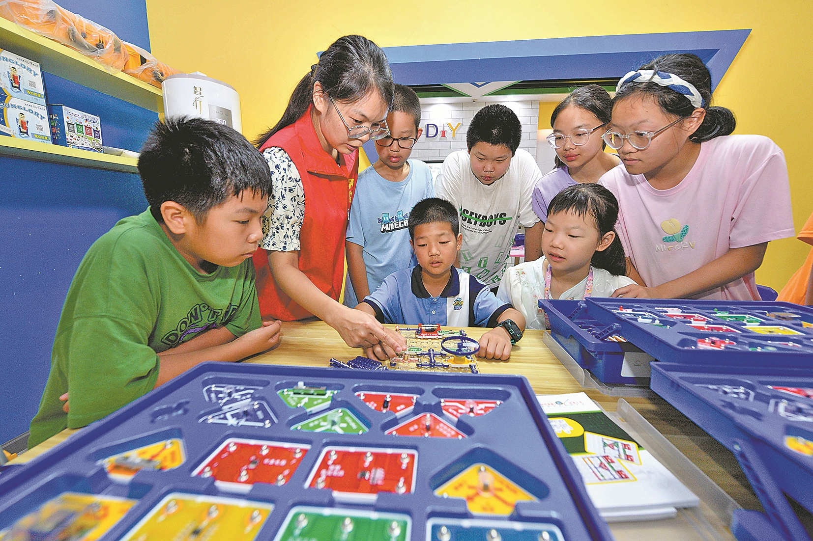 7月24日,在保康县科技馆创客体验室,工作人员指导学生用“电子百拼”拼装电路。