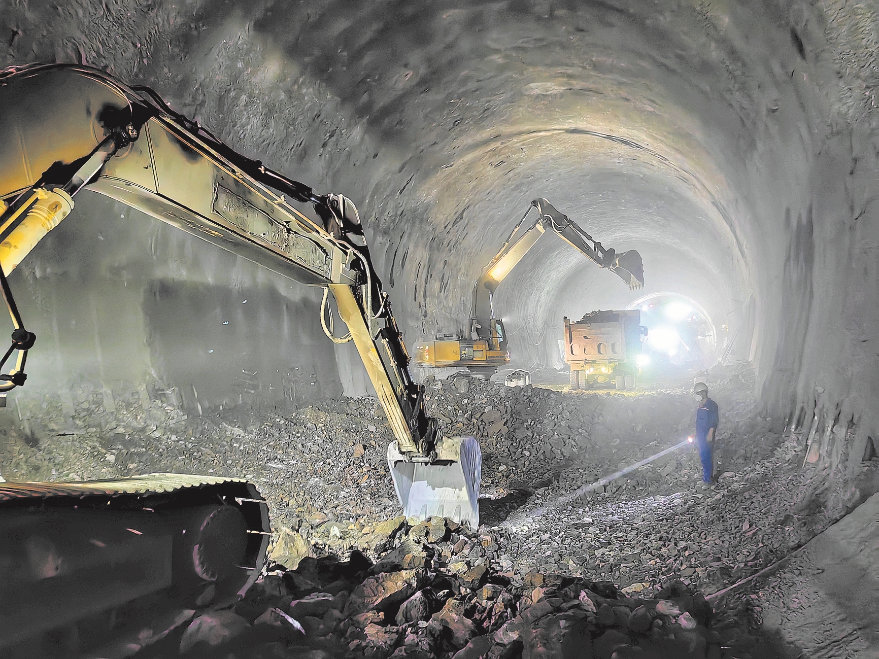 8月16日,施工人员在襄荆高铁周家冲隧道内清运渣石。