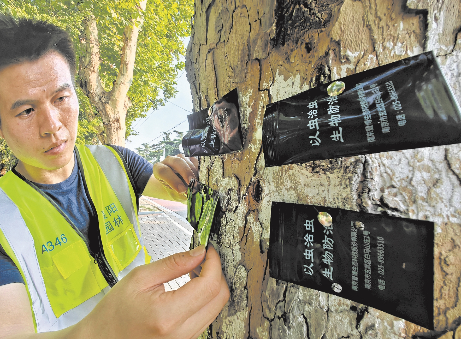 9月4日,园林工人在行道树上投放蛀干害虫的生物天敌。连日来,市住房和城市更新局绿化处对市区多个路段的700多棵行道树进行蛀干害虫生物防治,保护树木健康。