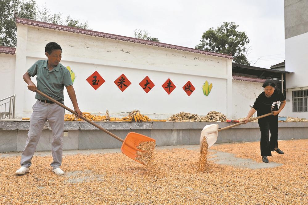9月5日,在老河口市黎家卡子村,村民在晾晒玉米。时下,老河口市的玉米、水稻、辣椒等农作物迎来丰收,村民利用晴好天气对农作物进行晾晒。