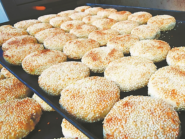 白杨:就着芝麻一口咬下去,月饼香极了。人们喜欢用包装纸接住月饼皮渣子,最后一口再倒进嘴里,细细咀嚼,很是满足。我们的月饼馅料丰富,甜而不腻,软硬适度,口感酥松清爽,留有余香。其制作工序主要分为4步,擀皮,制馅,包馅、外皮粘芝麻,烘烤。其中,擀皮最难,需要先将精面粉炒熟,采用食用油拌面和水加油拌面两种形式,将拌好的两种面团分别擀压折叠多次,再将两种擀压好的面皮合在一起擀压,形成月饼面皮。只有力道合适、油面混合均匀,才能确保口感酥松。