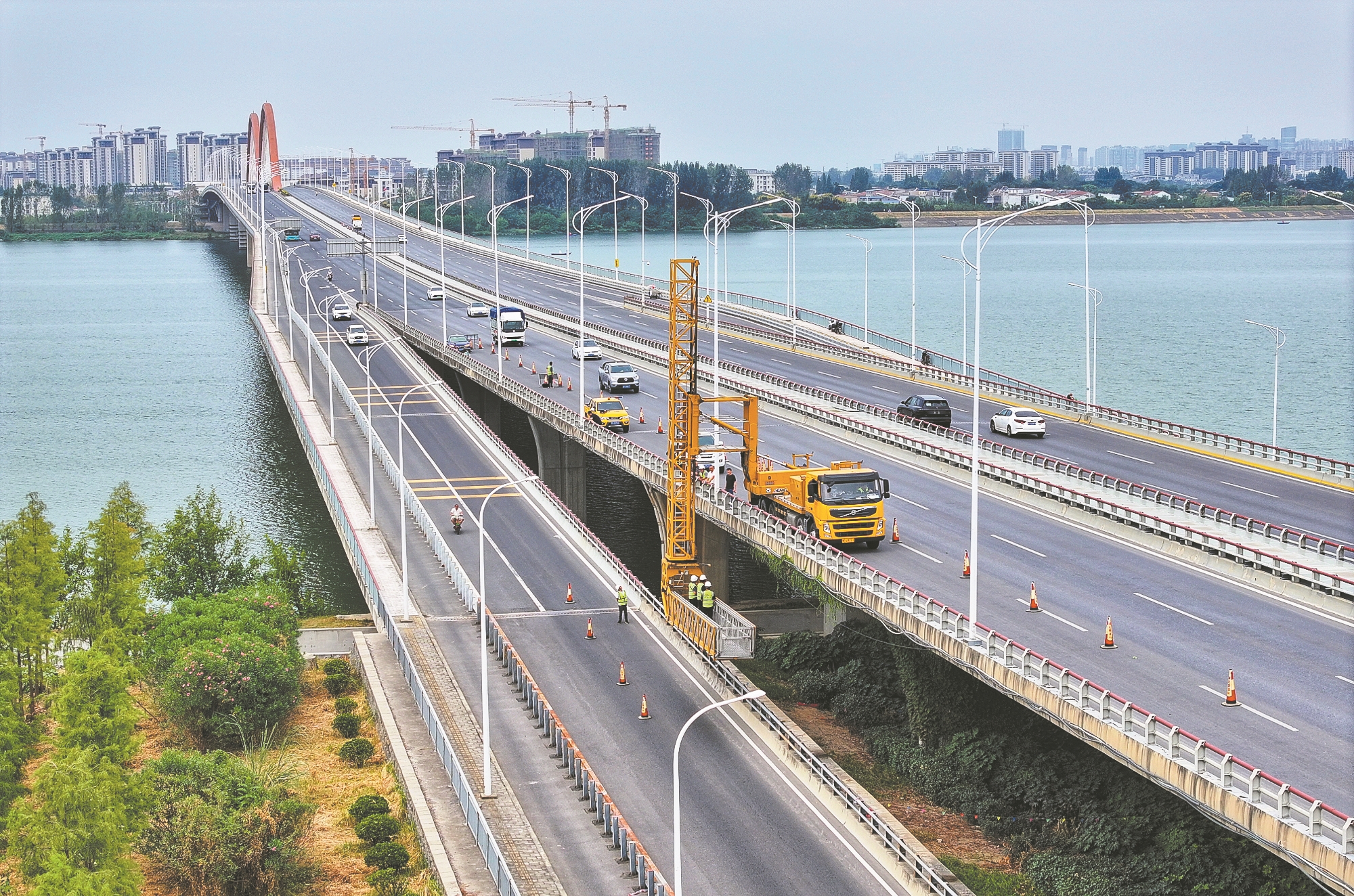 9月13日,市大桥管理处组织技术人员对东津大桥进行检测。