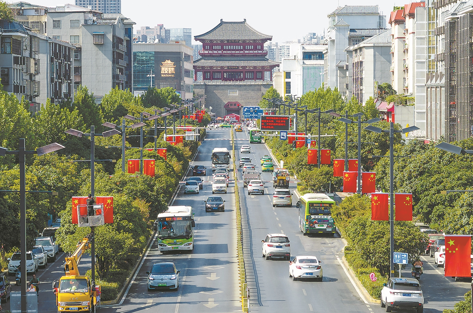 9月22日,工作人员在襄城区南街悬挂国旗。为迎接国庆节的到来,营造热烈、喜庆的节日氛围,我市城区街头、桥梁等处开始悬挂鲜艳的五星红旗。