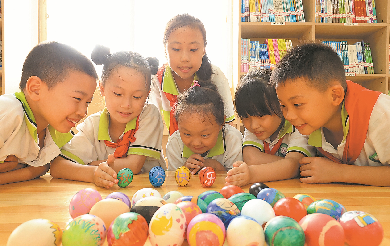 9月20日,樊城区竹条中心小学的老师向学生讲解秋分习俗的由来,并与学生一起体验秋分竖蛋这一传统习俗。 全媒体记者李旭晖 通讯员聂志鹏 杨红玫 摄